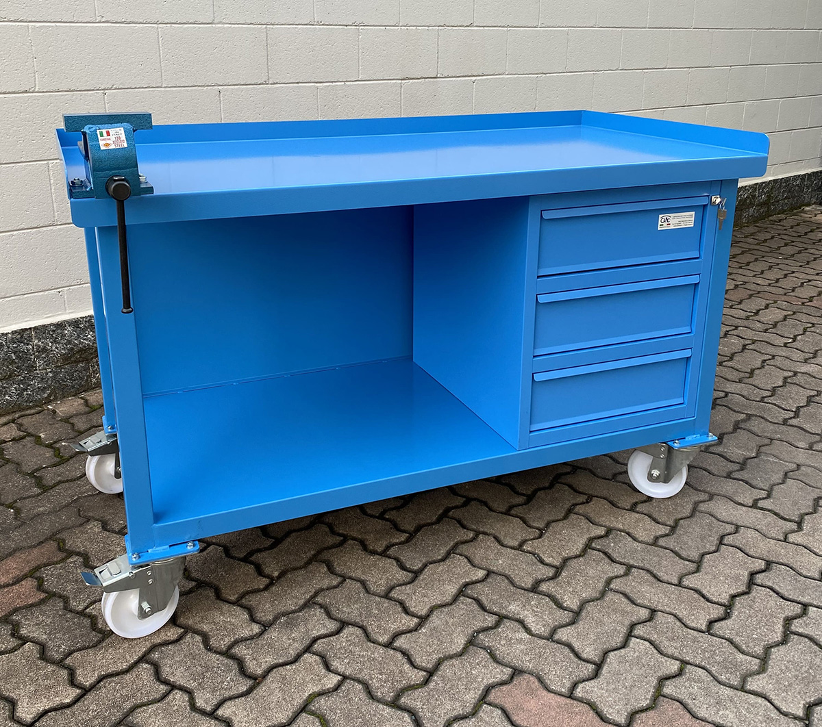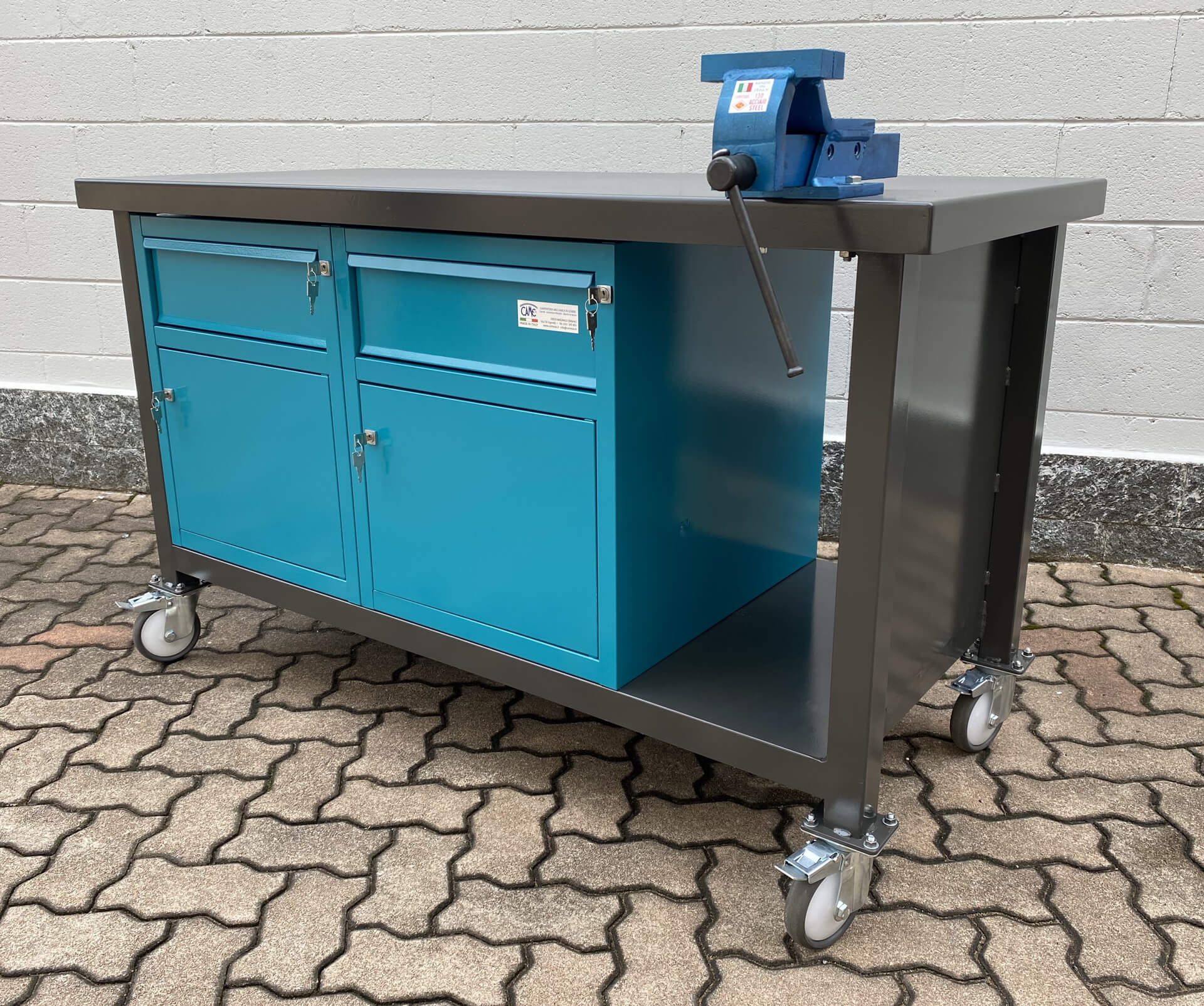 - Banchi da lavoro mobili con morsa: simili ai fissi ma dotati di ruote per la mobilità. Possono avere capacità di carico diverse a seconda che il telaio sia abbassato (sui piedi) o sollevato (sulle ruote).