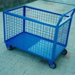 Metal mesh trolleys are commonly used for the transport and storage of bulk materials.